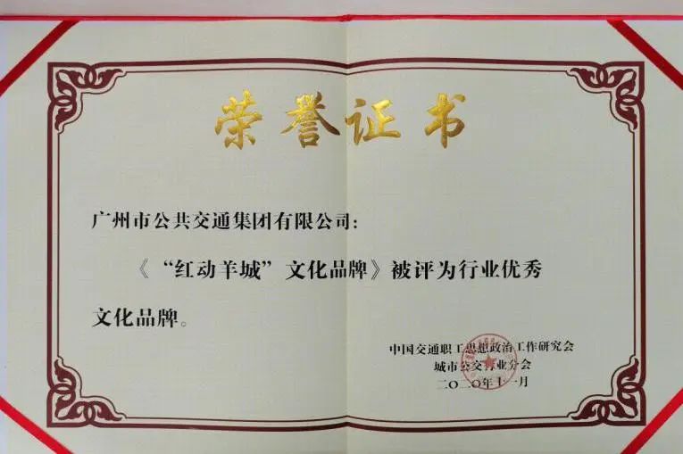 中國交通職工思想政治工作研究會城市公交行業分會頒發的“行業優秀文化品牌”。