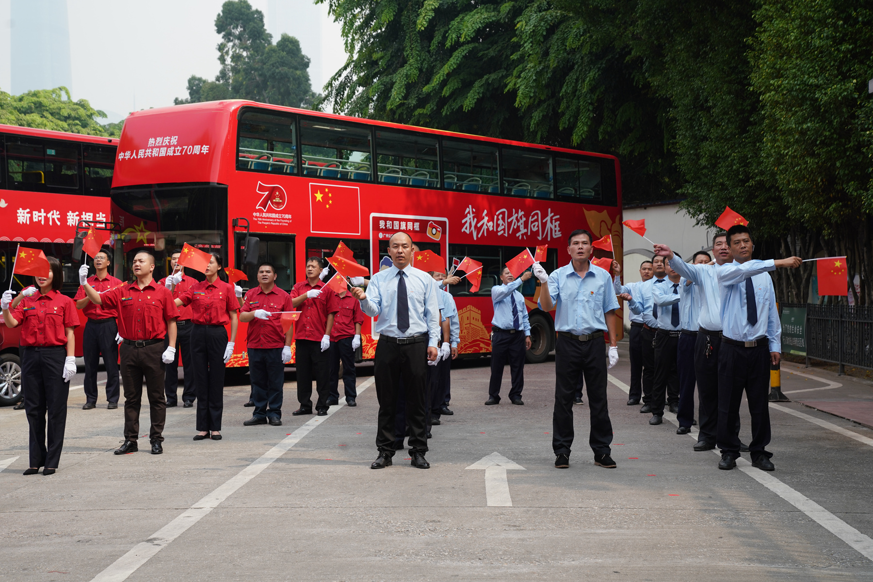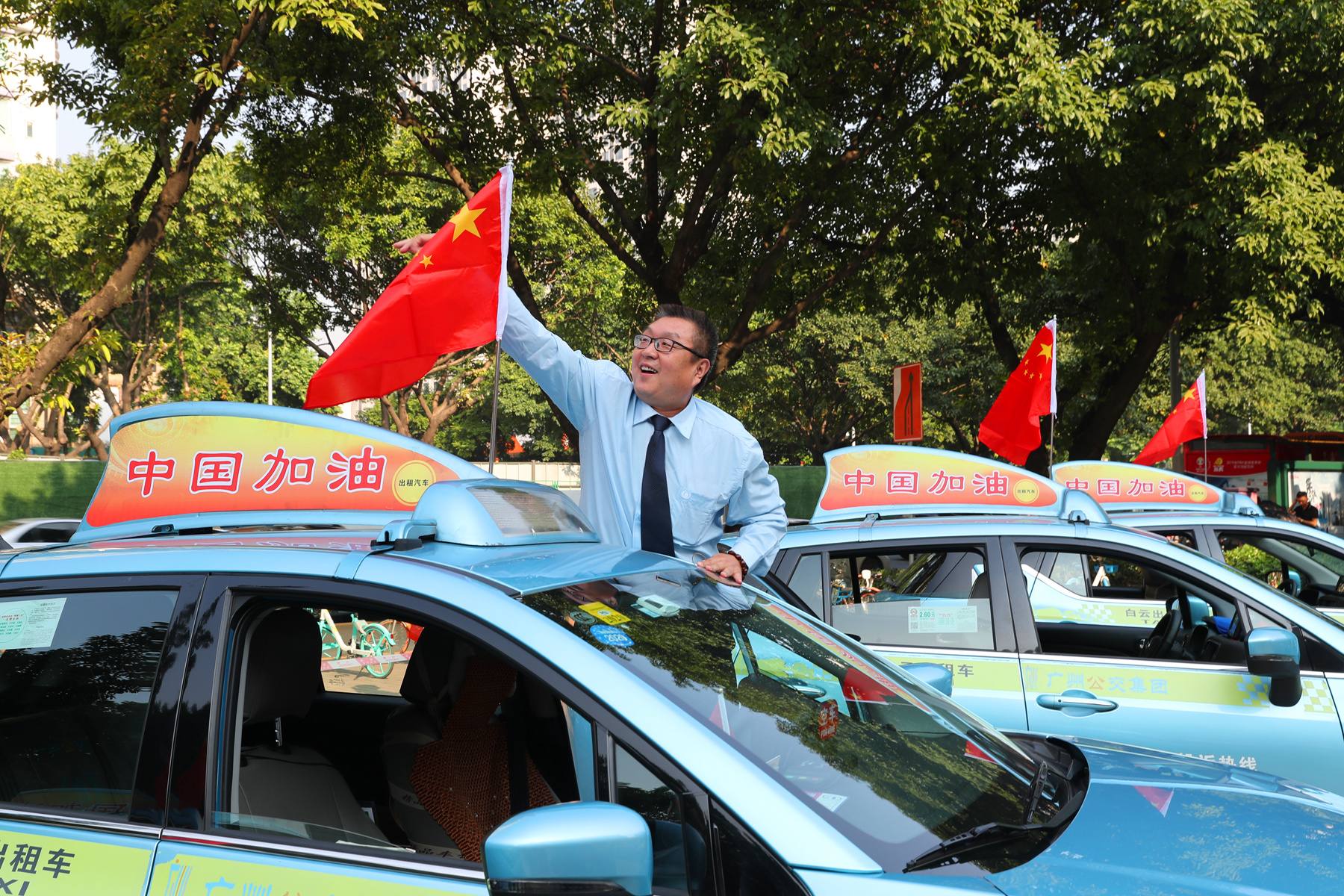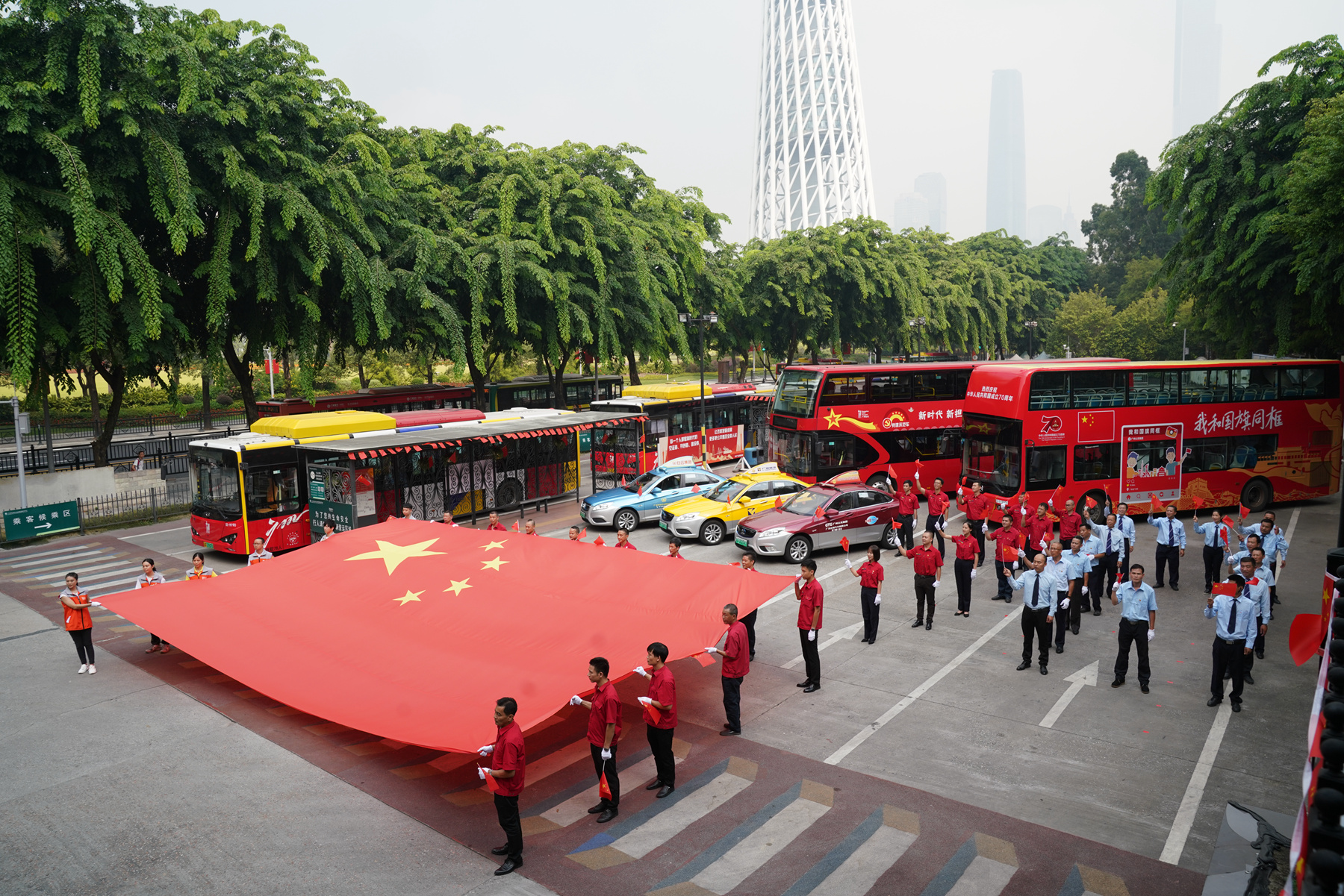 這是廣東省文明辦指導、廣州市交通局組織,廣州市公交車、出租車共同開展的“我和我的祖國”活動內容之一。即日起至國慶期間,廣州市中心區800多條公交線路約1.2萬輛公交車、3萬多輛出租汽車(含巡游車和網約車)都將在醒目位置粘貼和擺放五星紅旗,愛國之情將隨著車流流入廣州的大街小巷。