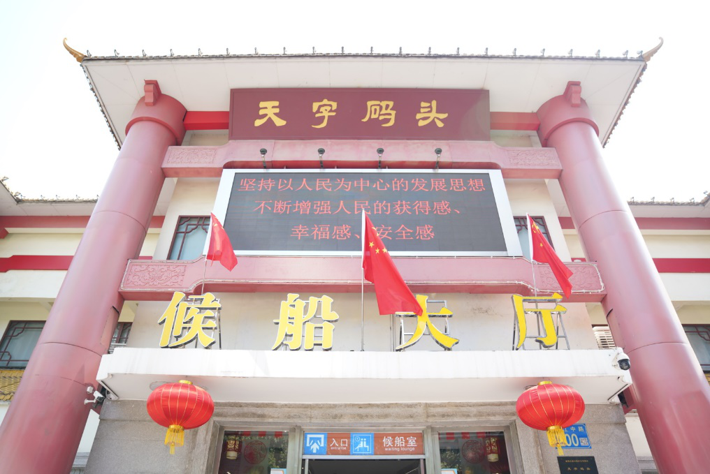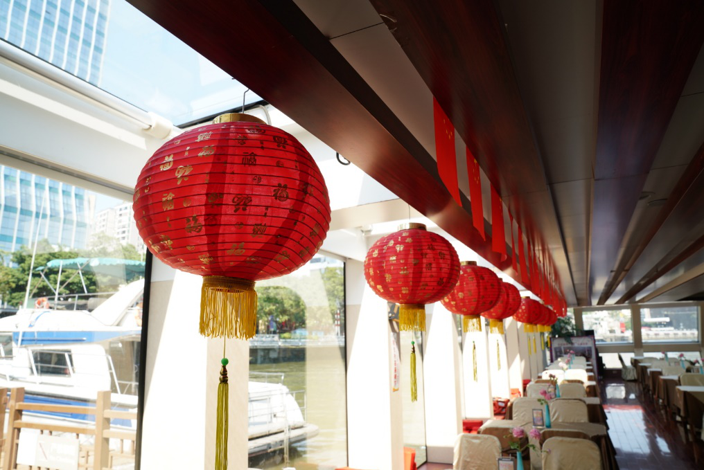 與此呼應,在天字碼頭,鮮艷的國旗迎風招展,珠江游船內也布置一新,整齊地掛出了國旗。國慶節前,廣州公交集團客輪公司在屬下29個營運碼頭及58艘水上巴士、珠江游船上布置了242面五星紅旗,珠江上多了一抹熱情洋溢的中國紅。