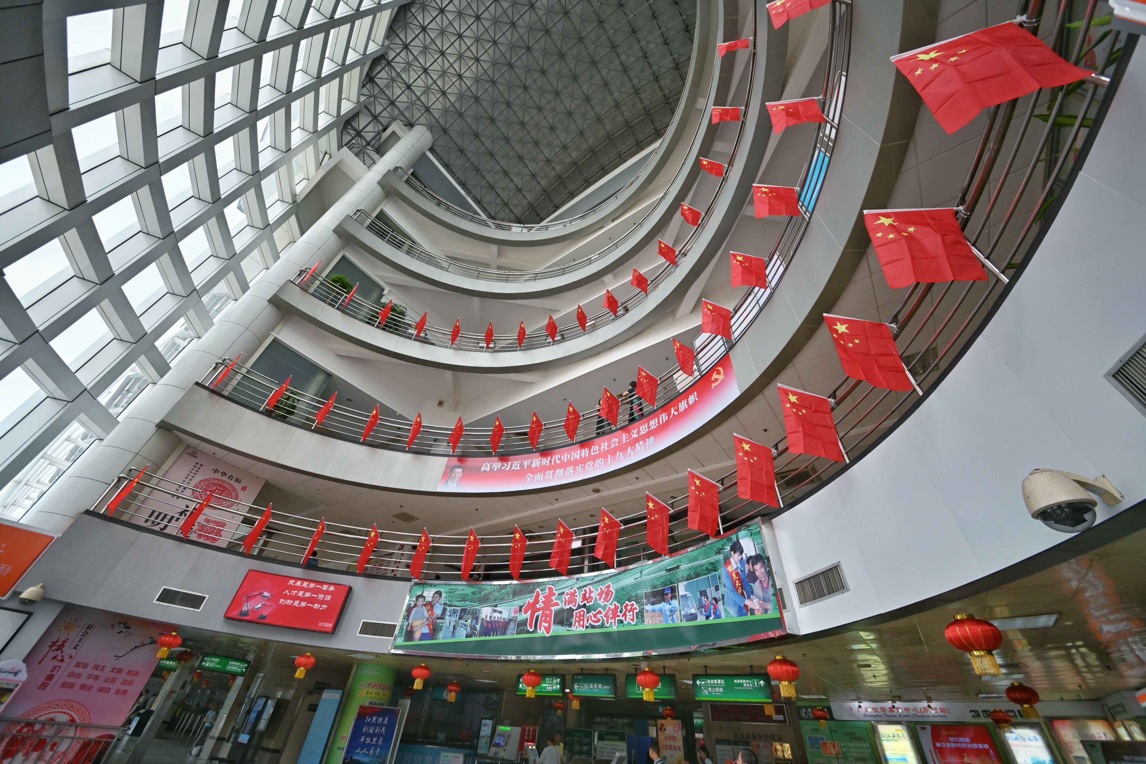 在天河客運站、滘口客運站,LED大屏滾動播放著慶祝新中國成立70周年的公益短片和海報,讓南來北往的人們在旅途中也能感受到濃厚的節日氣氛。省汽車客運站內也布置一新,落客區人行通道、車站外圍等處,50面國旗隨風飄揚。