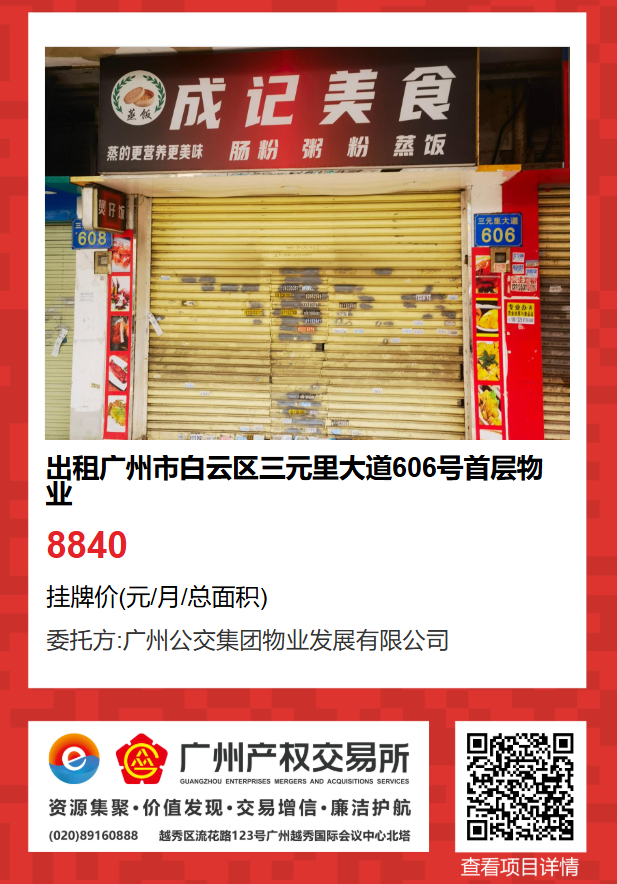 現(xiàn)有廣州市白云區(qū)三元里大道606號(hào)首層物業(yè)出租項(xiàng)目,該項(xiàng)目在廣州公有物業(yè)出租平臺(tái)網(wǎng)站自掛牌公開招租,歡迎有意向的企業(yè)法人或自然人(含個(gè)體工商戶)參加應(yīng)租。現(xiàn)將有關(guān)事項(xiàng)說明如下: