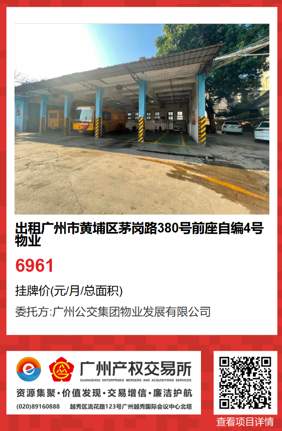 現(xiàn)有廣州市黃埔區(qū)茅崗路380號前座自編4號物業(yè)出租項目。該項目在廣州產權交易所網站掛牌公開招租,歡迎有意向的企業(yè)法人或自然人(含個體工商戶)參加應租。現(xiàn)將有關事項說明如下: