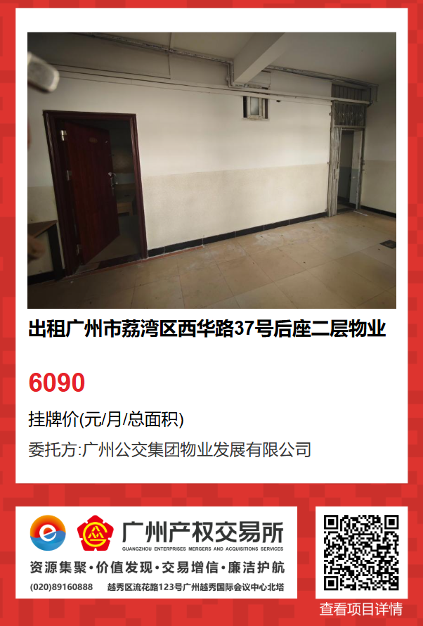 現(xiàn)有廣州市荔灣區(qū)西華路37號后座二層物業(yè)出租項目,該項目在廣州公有物業(yè)出租平臺網(wǎng)站自掛牌公開招租,歡迎有意向的企業(yè)法人或自然人(含個體工商戶)參加應(yīng)租。現(xiàn)將有關(guān)事項說明如下: