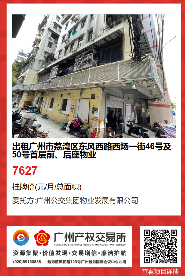 現(xiàn)有廣州市荔灣區(qū)東風(fēng)西路西場一街46號及50號首層前、后座物業(yè)出租項(xiàng)目,該項(xiàng)目在廣州公有物業(yè)出租平臺(tái)網(wǎng)站自掛牌公開招租,歡迎有意向的企業(yè)法人或自然人(含個(gè)體工商戶)參加應(yīng)租。現(xiàn)將有關(guān)事項(xiàng)說明如下: